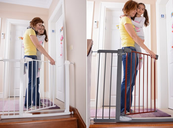 Çift emniyet mekanizması mevcuttur. Güvenlik kapısı her iki yöne de açılabilir özelliğe sahiptir. Kapıyı geçtikten sonra bıraktığınızda otomatik kapanır ve kilitlenir. Kapıyı açık unutma riskiniz böylece ortadan kalkar. 75 ile 85 cm arasında kendi başına ayarlanabilir. Ölçünüz daha büyükse Haricen satın alacağınız 10 20 ve 45 cm ölçülerindeki uzatma parçalarıyla ihtiyacınız olan ölçülerde de kullanabilirsiniz.